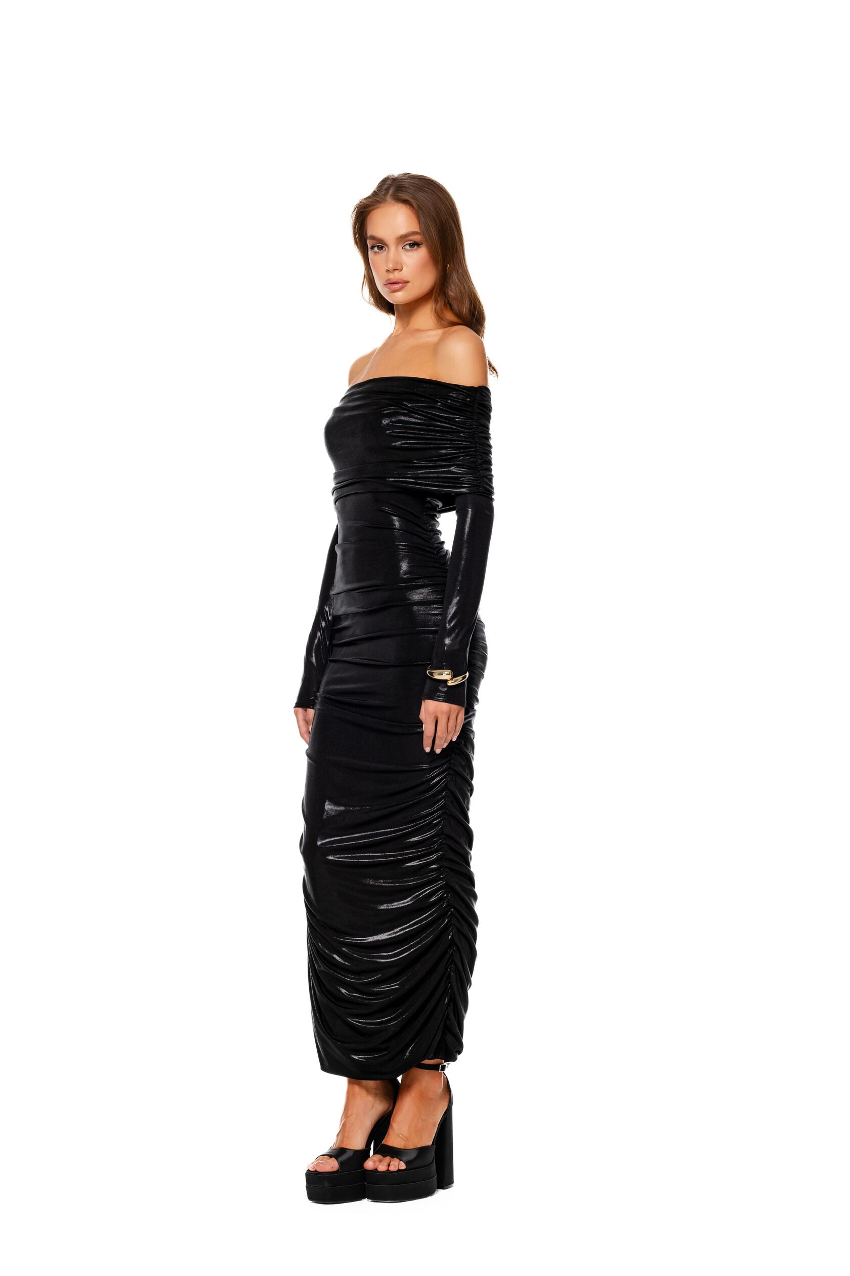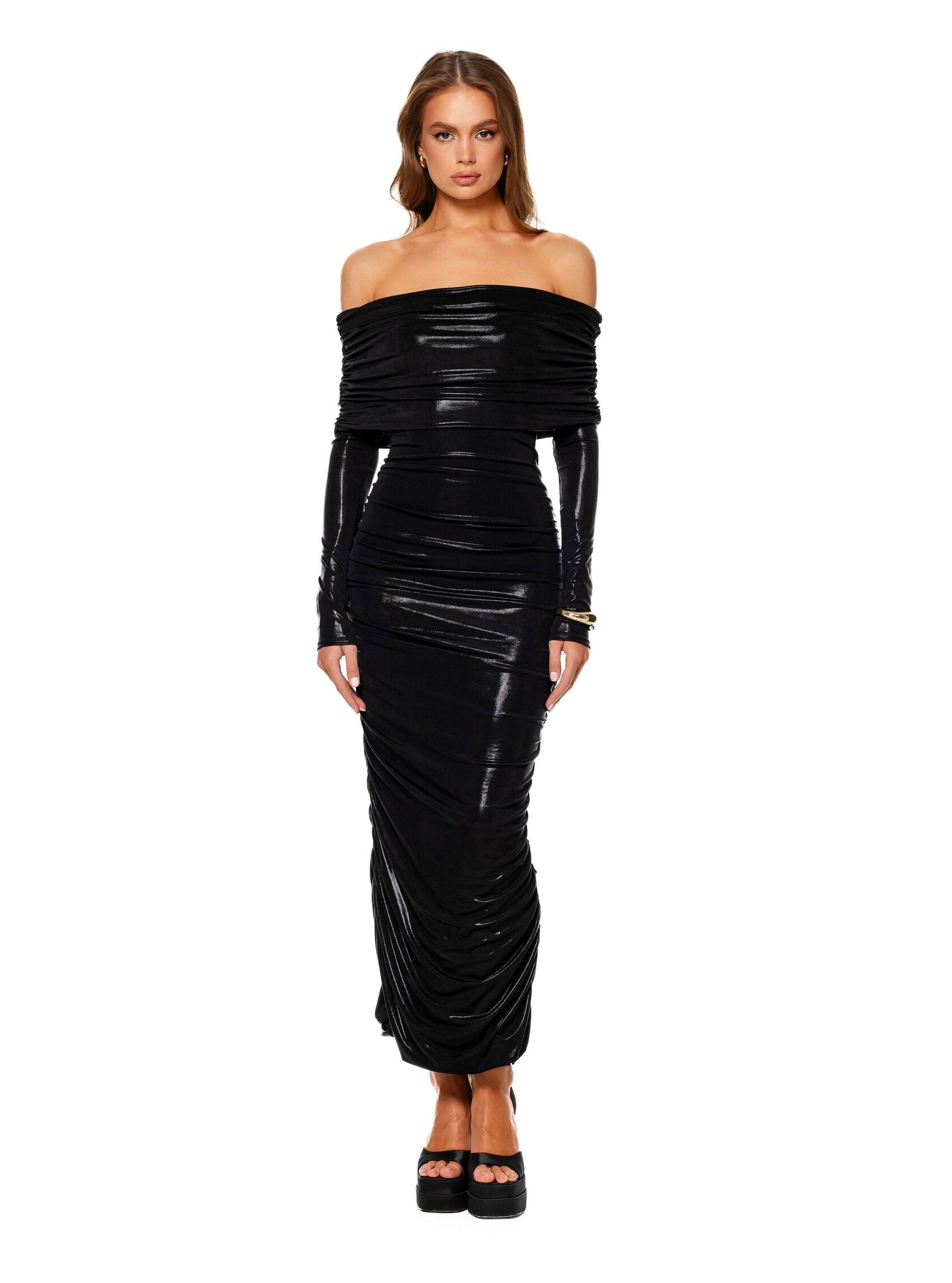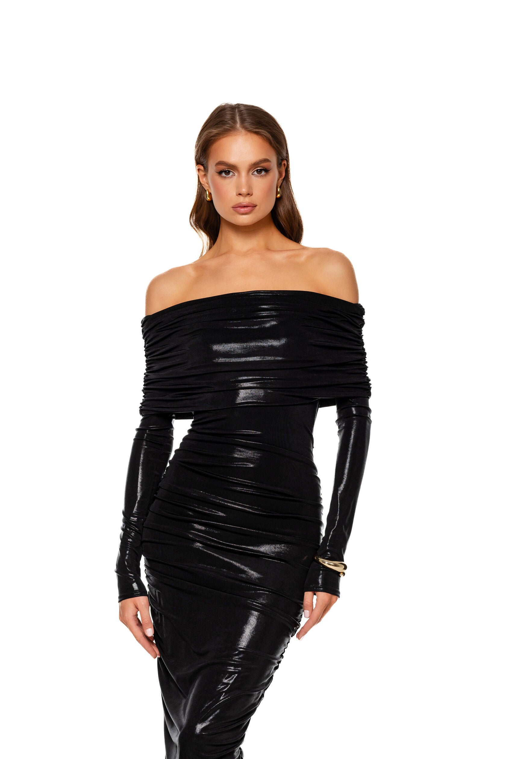 Style it with sleek fresh from the sea hair and layers of gold necklaces.
